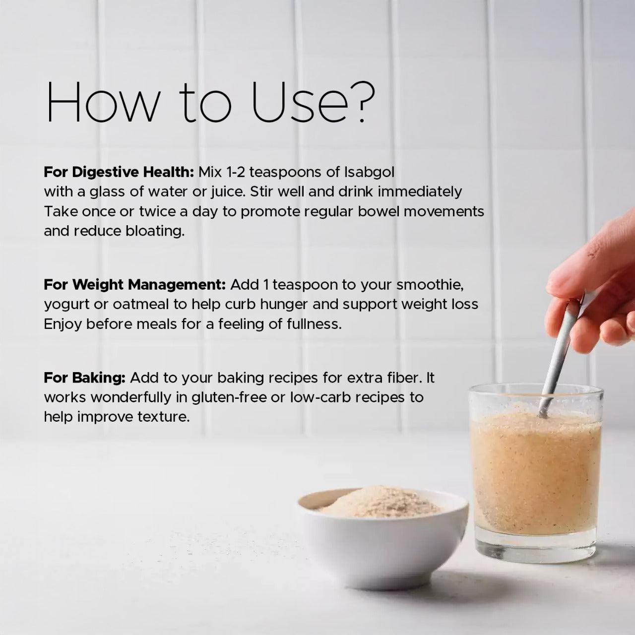 - For Digestive Health: Mix 1-2 teaspoons of Psyllium Husk with a glass of water or juice. Stir well and drink immediately. Take once or twice a day to promote regular bowel movements and reduce bloating.