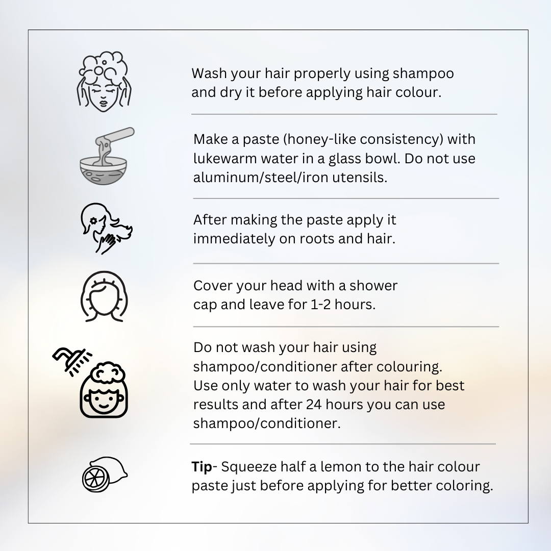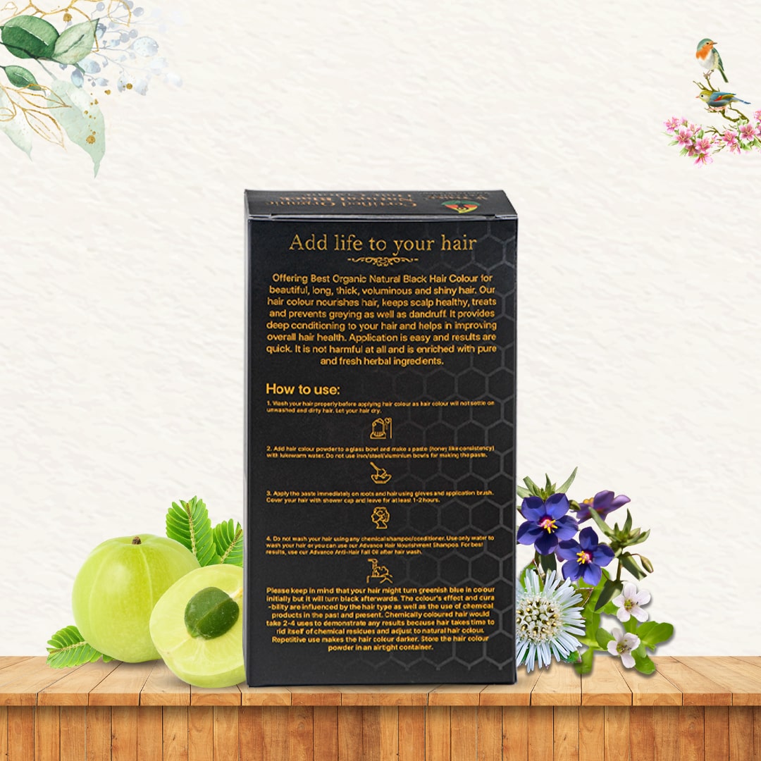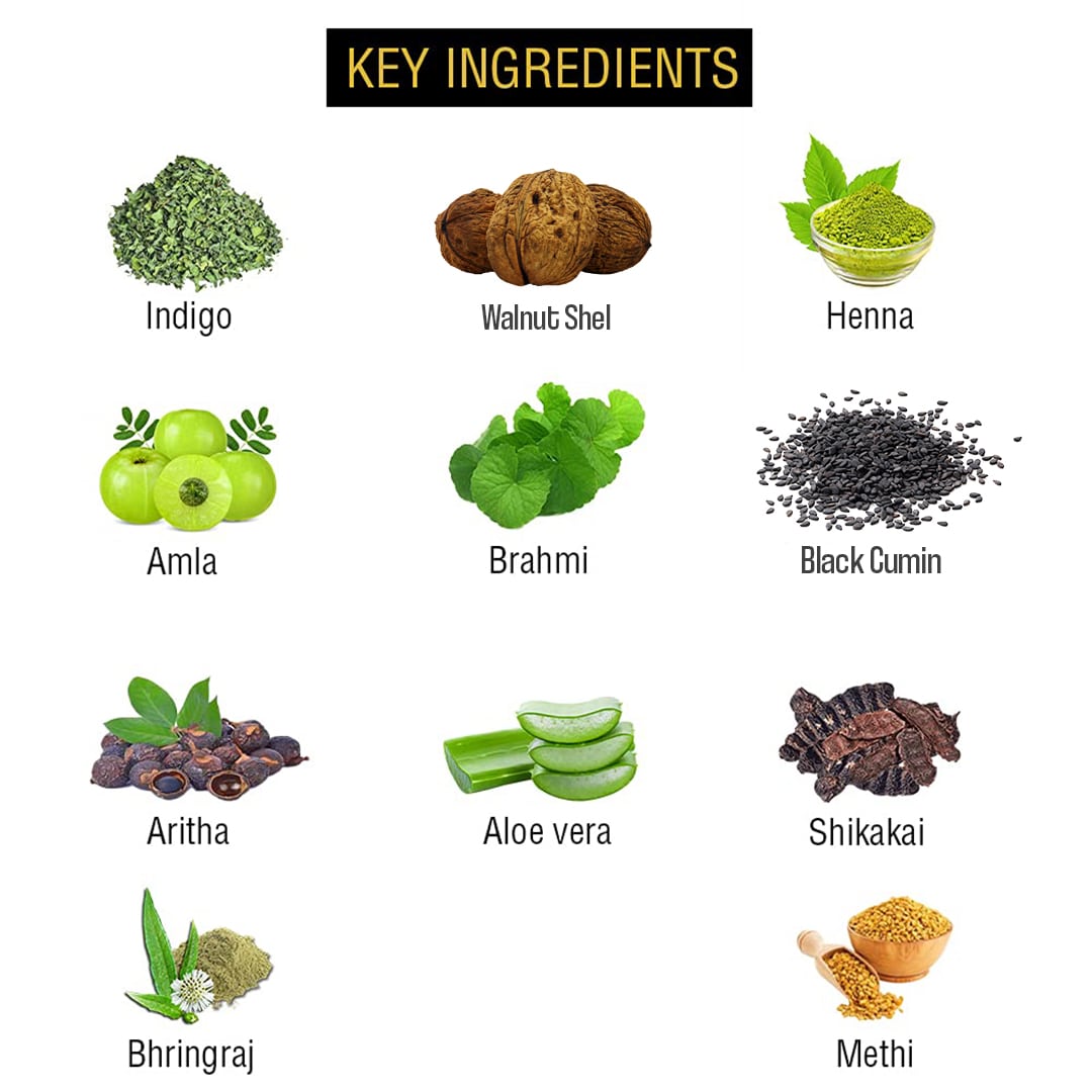 - Made with Indigo, Henna, Coffee Seeds, Amla, Shikakai, Brahmi, Aritha, Methi, Bhringraj, etc.